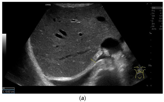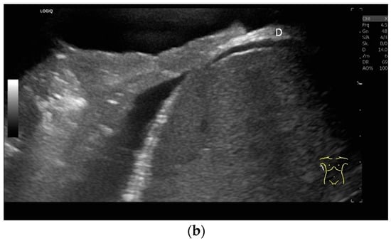 With abdominal sector transducers (a) and in elderly people (b), the diaphragm can appear hyperechoic. D—diaphragm.
