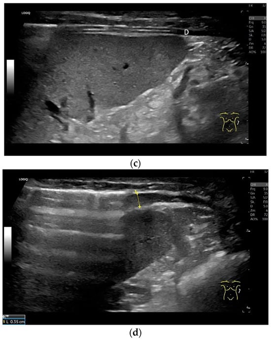 Measurement of the diaphragm thickness on the right and left in the apposition zone (9 MHz linear transducer). The markers are positioned within the peritoneum and the pleura. They are located on the outer contour of the hypoechoic muscle (a,b). The delicate hypoechoic collagenous central fiber is also visible. The diaphragm is thinner in the end-expiratory phase (a) than in the contracted end-inspiratory phase (b). The same measurements are performed on the left in the apposition zone. The diaphragm between the intercostal spaces and the spleen can be seen below the pulmonary glide, thinner at end-expiration phase (c) and during end-inspiratory contraction (d). D—diaphragm.