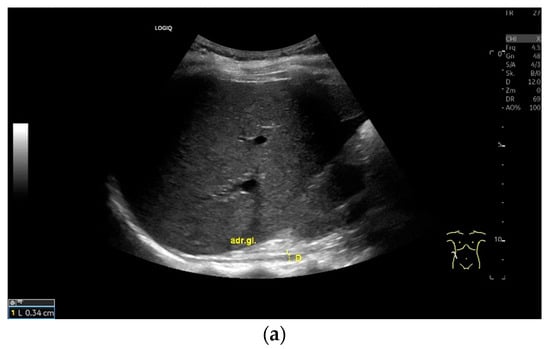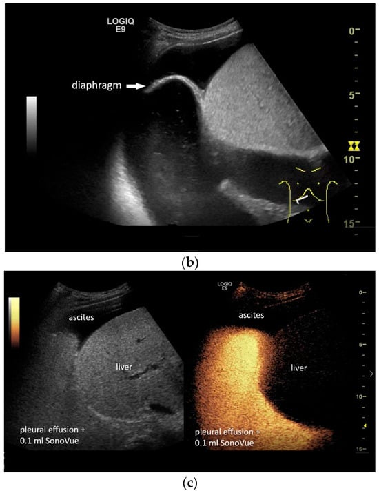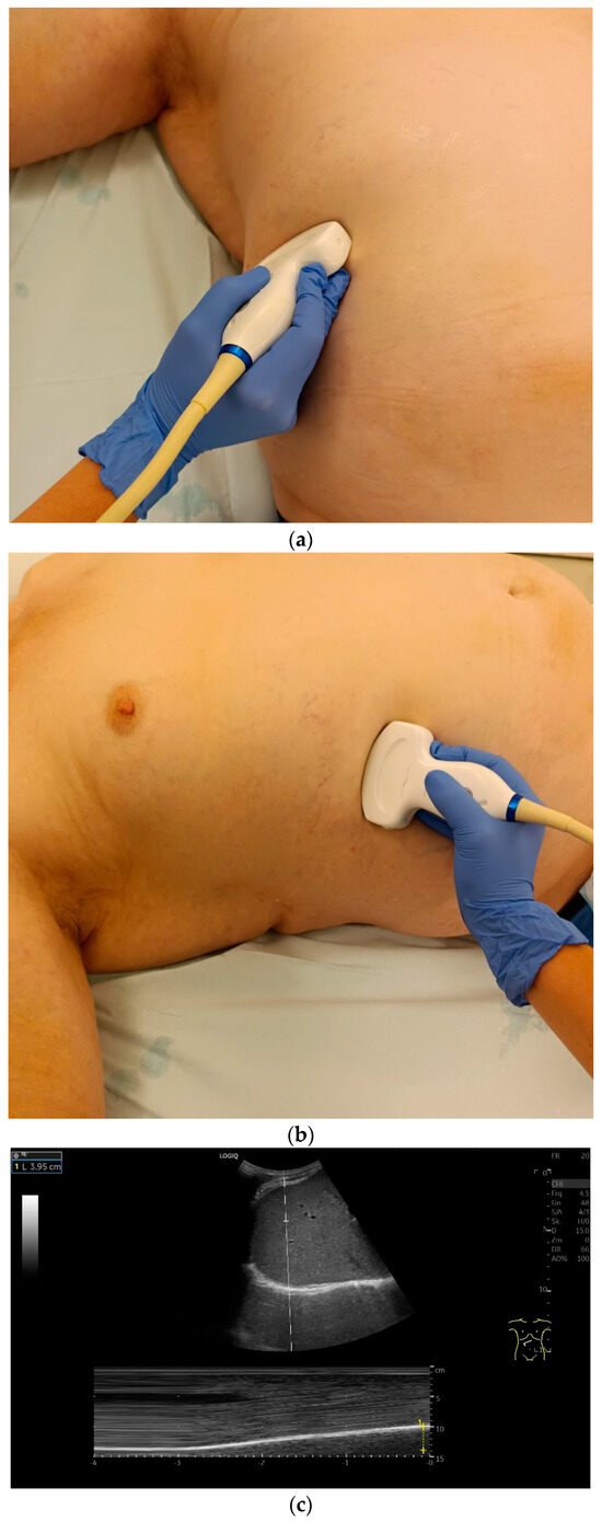 Transducer positions for visualization of the apposition zone on the right. The transducer is positioned longitudinally and laterally in the area of the mid-axillary line or slightly ventrally between the anterior and mid-axillary line, approximately in the 8th or 10th intercostal space (a,b). The diaphragm is located caudal to the pulmonary glide (typical A-lines/reverberation artifacts) (c). It is located on the inside of the intercostal spaces.