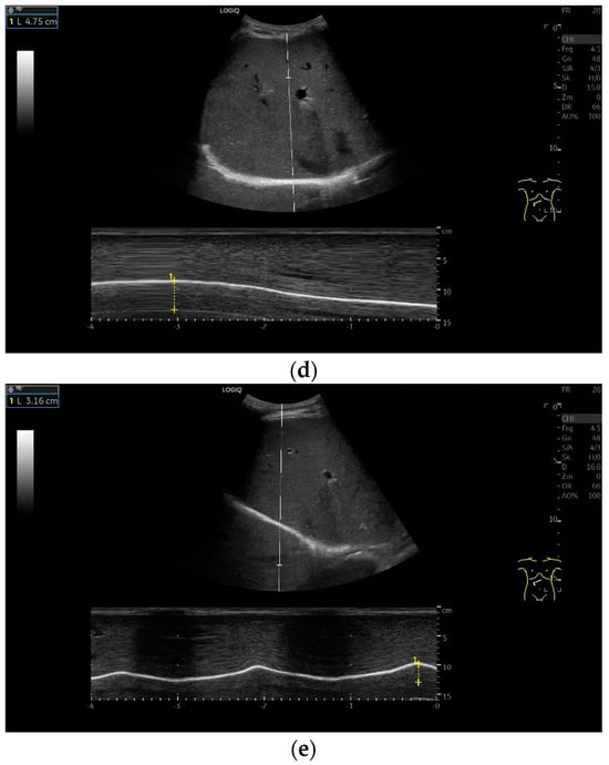 Subcostal transducer positions. The transducer is placed between the medioclavicular line and the anterior axillary line (a,b). The diaphragm excursion can then be visualized and measured in M-mode during breath holding and deep inspiration (c,d) and voluntary “sniffing” or coughing (e).