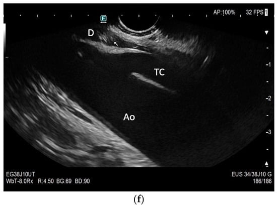 Subxiphoid transducer positions. The right diaphragmatic fat limb runs between the inferior vena cava and the aorta to the right of the spine. The left diaphragmatic limb is shown to the left of and dorsal to the aorta. Diaphragm between the markings (a). The diaphragm in the color Doppler imaging (CDI) between the vessels. The incisions should not be confused with lymphomas (b). The diaphragm on the right between the inferior vena cava and the spine (between the markings) and in front of the abdominal aorta (c). The thickened diaphragm during inspiration (between the markings) in the same position. Under optimal examination conditions, the contraction can also be visible in this position (d). The diaphragm between the aorta and liver is visible in longitudinal section (e). Endosonography shows the diaphragmatic limb ventral to the aorta (arrow) (f). Ams—superior mesenteric artery, Ao—aorta, Ard—right renal artery, D—diaphragm; IVC—vena cava inferior, PV—portal vein, TC—celiac trunk, Vl—splenic vein.
