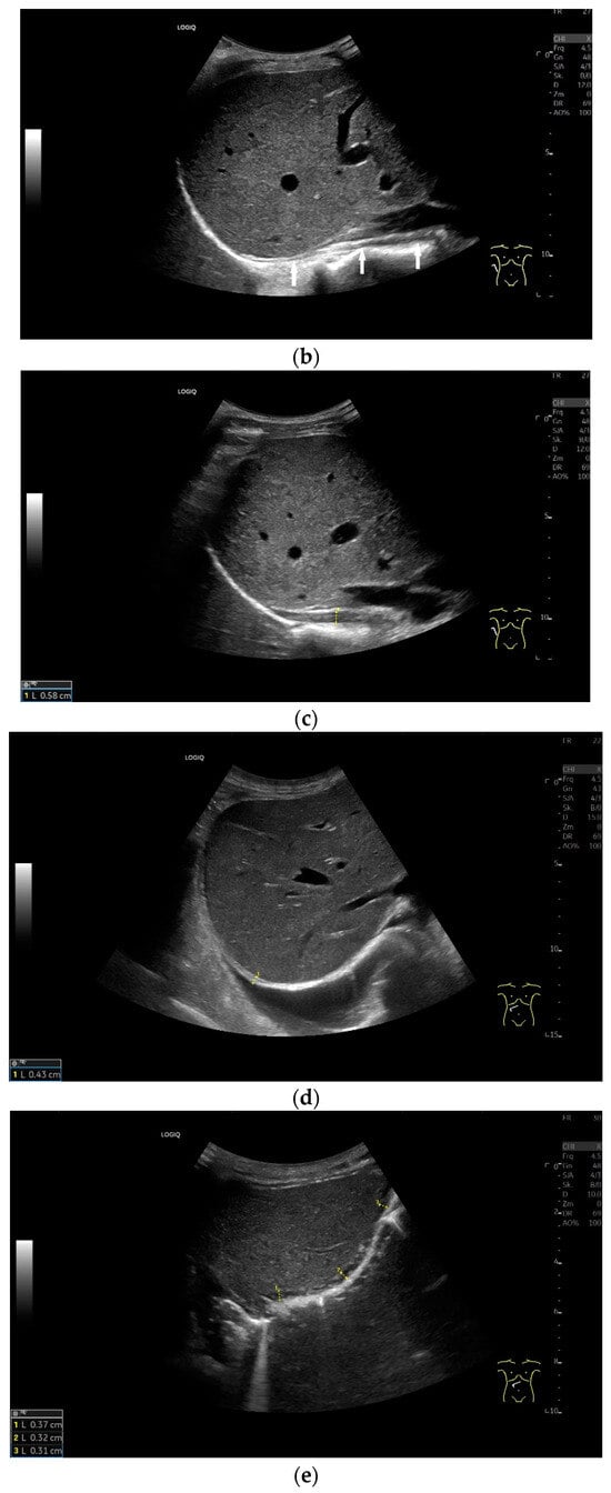 The diaphragm is a hypoechoic muscular structure, the echogenicity of which increases with age. An increased body mass index (BMI) can also lead to an increase in diaphragm echogenicity. However, gender has no influence on echogenicity [1]. With abdominal sector transducers (2–5 MHz), the diaphragm can appear as a hyperechoic line. Overall, the echogenicity of the same patient may differ with different devices [1] (Figure 2).