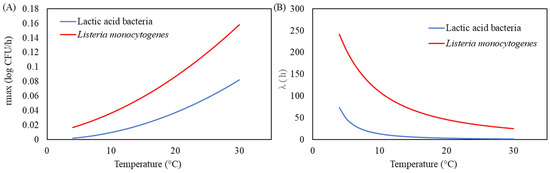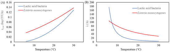 Relationship between temperature and (A) rmax and (B) λ using modified Gompertz model and secondary model of Ratkowsky for milk. The solid blue and red lines represent the predicted for lactic acid bacteria (LAB) and L. monocytogenes, respectively.