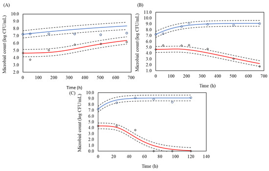 Microbial counts of lactic acid bacteria (LAB) (○) and L. monocytogenes (◊) in co-culture using brain heart infusion (BHI) broth at (A) 4 °C, (B) 10 °C and (C) 30 °C. The solid blue and red lines represent the predicted growth curves for LAB and L. monocytogenes, respectively, based on the Lotka-Volterra model. The dashed lines indicate confidence bands of 95%, used to compare observed versus predicted interaction between LAB and L. monocytogenes.