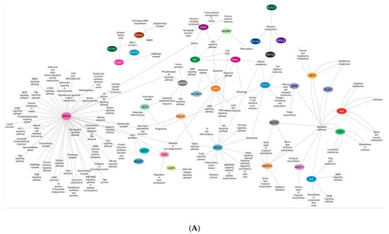 (A) An interactive gene–pathway network generated by Cytoscape comprising the genes (outlined in colored circles) that exhibited hypomethylation and the genes involved in multiple biological pathways. (B) An interactive gene–pathway network generated by Cytoscape comprising the genes (outlined in colored circles) that exhibited hypermethylation and the genes involved in multiple biological pathways.