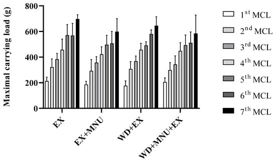 | CTR (n = 7) | CTR+MNU (n = 5) | EX (n = 7) | EX+MNU (n = 6) | WD (n = 7) | WD+MNU (n = 7) | WD+EX (n = 7) | WD+MNU+EX (n = 7) | |