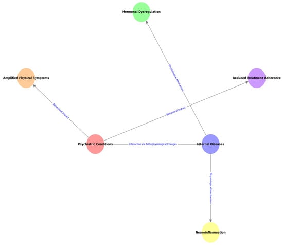 The relationship between psychiatric conditions and internal diseases is multifaceted and bidirectional, shaping the onset, progression, and management of both categories of conditions (Figure 3). This intricate connection highlights how internal diseases can predispose individuals to psychiatric symptoms through physiological changes, such as neuroinflammation or hormonal dysregulation, while psychiatric conditions can exacerbate the course of internal diseases by reducing treatment adherence or amplifying physical symptoms. Recognizing and addressing this interdependence is fundamental for providing comprehensive, patient-centered care [3,4].