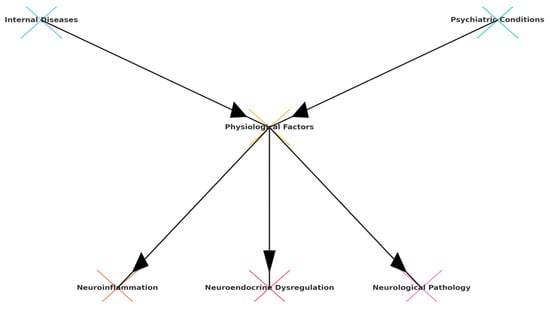 Understanding the physiological mechanisms underlying the interplay between internal diseases and psychiatric conditions is essential for elucidating the pathophysiology of comorbid symptoms. Key factors include neuroinflammation, neuroendocrine dysregulation, and neurological pathology (Figure 4).