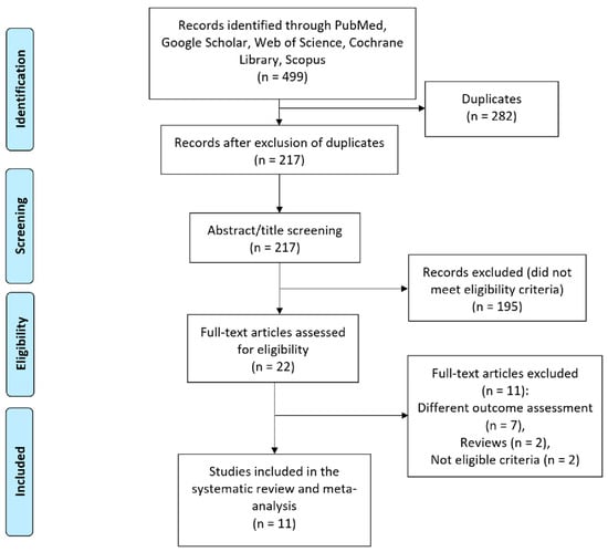 The initial data retrieval process extracted 217 potentially eligible records. After screening for title and abstract according to inclusion and exclusion criteria, 22 studies were assessed for full-text screening. After further eligibility checking, 11 studies comparing CCH and PNF were included in this systematic review and meta-analysis. The study flow and selection process are summarised as a PRISMA flow diagram in Figure 1.