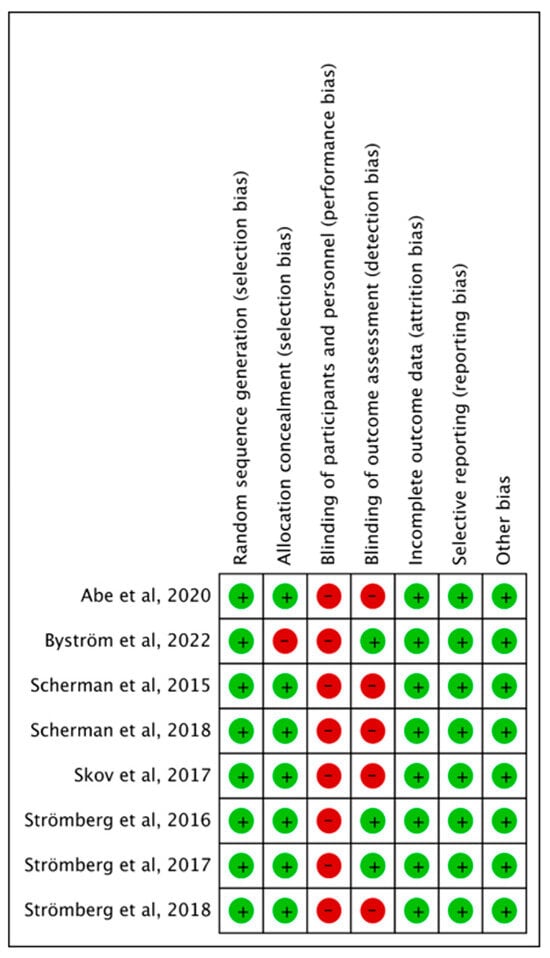 The quality of RCTs was evaluated by the Cochrane RoB-1 tool and illustrated in Figure 2. RCTs lacked double blinding in all studies but were otherwise considered high quality. Retrospective studies were evaluated using NOS (Supplementary Table S2); two [8,14] were considered high quality (Supplementary Table S3), while Nydick et al., 2013 [6] was considered moderate quality.