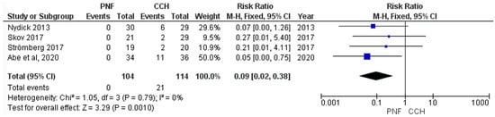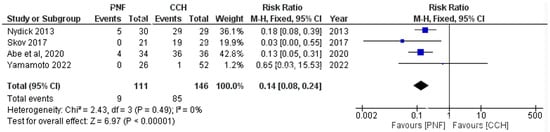 No significant differences were detected between CCH and PNF for skin tears (RR = 0.86 [0.54, 1.39], p = 0.55) and the results were homogenous (I2 = 37%, p= 0.19, Supplementary Figure S2). No major complications (tendon rupture, nerve, or vessel injury) were reported in either treatment group.