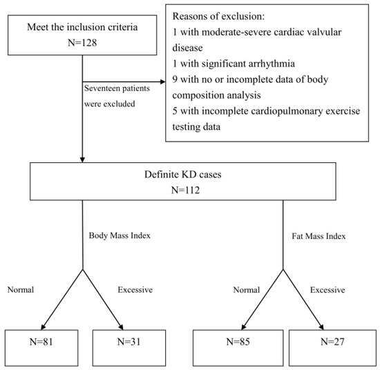 One hundred twenty-eight patients with KD qualified for the inclusion criteria. Of these, sixteen patients were excluded (one each with moderate and severe cardiac valvular disease, one with significant arrhythmia, nine with no or incomplete data of body composition analysis, and five with incomplete CPET data). Therefore, 112 children and adolescents with KD were included in this study (Figure 1).