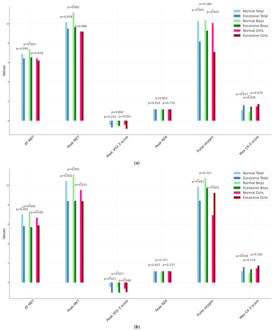 In terms of BMI classification, normal BMI participants (n = 81) had significantly higher pulse oxygen levels (p = 0.001), along with a lower Max CA Z-score (p = 0.017) compared to those with excessive BMI (n = 31). Boys with normal BMI (n = 40) showed significantly higher values for AT MET (p = 0.024), peak MET (p = 0.001), as well as a lower Max-Z (p = 0.039) compared to boys with excessive BMI (n = 21). Girls with normal BMI (n = 41) had only significantly higher pulse oxygen levels (p = 0.023) compared to girls with excessive BMI (n = 10) (Figure 2a).