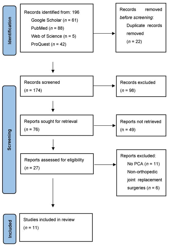 A total of 196 papers were extracted from four databases (Google Scholar, PubMed, Web of Science, and ProQuest), out of which 22 were omitted as duplicates. Of the remaining 174 articles, 147 were excluded. Following screening and assessment, 17 articles were excluded because the patients did not receive patient-controlled analgesia (PCA) (n = 11) or the studies did not include orthopedic joint replacement surgeries (n = 6). A total of 11 articles were considered suitable for this systematic review (Figure 1).