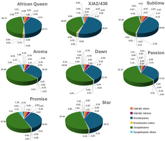 Comparison of the different classes included aliphatic ester, -ketones, -aldehydes, -alcohols, alkanes, di-, mono-, sesquiterpenes and their alcohols, aldehydes, esters ethers and oxygenated forms. Figure 1 illustrates mono- and sesquiterpenes to be present in the highest fractions with notable differences in distribution amongst varieties. Oil from experimental variety XJA2/436 had the highest fraction of monoterpenes (49.61%) and Southern Aroma the highest fraction of sesquiterpenes (54.46%). Southern Sublime oil had higher fractions of sesquiterpenic esters (4.97%) and XJA2/436 notably lower aliphatic ketones (0.91%). Sesquiterpenic ether fractions were slightly higher in Southern Promise (3.12%) compared to the other varieties. The full dataset can be viewed in Supplementary Table S1.