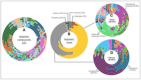 Aliphatic compound distribution in 8 hop oils. Inner to outer rings represent African Queen, XJA2/436, Southern Sublime, Southern Aroma, Southern Dawn, Southern Passion, Southern Promise and Southern Star. (A) represents all the aliphatic compounds and serves to demonstrate their diversity in the hop oils. (B) Aliphatic compounds grouped according to class. The percentages indicated were calculated fractions of the total aliphatic compounds only. (C) represents the ester and (D) ketone components of the oils. 2-Methylbutyl isobutyrate and methyl (4Z)-decenoate were the two most abundant esters and 2-undecanone and 2-tridecanone the two most abundant ketones recorded.