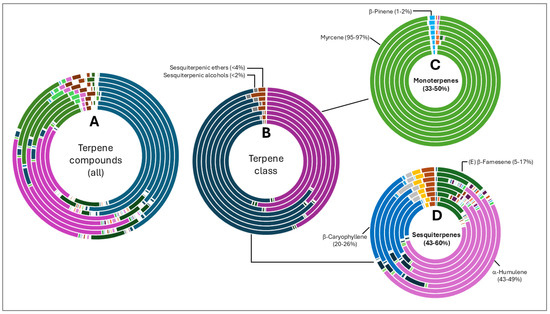 Terpenes are a diverse family of natural products synthesised by plants, with approximately 55,000 members [7,57]. Most terpenes are found in the essential oil fraction of plant oils, and they can be described as aromatic hydrocarbon molecules produced by almost every plant, and some animals, for interaction with other organisms [58]. A total of 58 different terpenes, 16 mono- and 42 sesquiterpenes, were present in South African hop oils, the most abundant compounds were the monoterpene myrcene (27.8–48.15%) and sesquiterpenes α-humulene (19.52–24.98%), β-caryophyllene (8.47–13.73%) and β-farnesene (2.08–7.57%).
