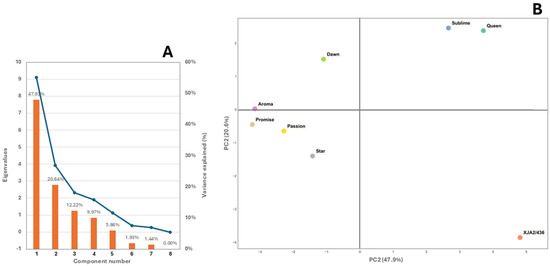 (A) Scree plot depicting the eigenvalues of the principal components, where the x-axis represents the component number. The blue line on the y-axis shows the corresponding eigenvalue and bars indicate the % variance explained. (B) Principal components analysis (PCA) performed on the major chemical classes for the eight South African hop varieties African Queen, XJA2/436, Southern Sublime, Southern Aroma, Southern Dawn, Southern Passion, Southern Promise and Southern Star.