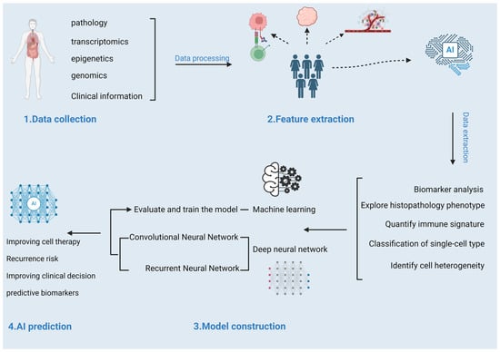 Given the heterogeneity in patient responses to ICIs and the pivotal role of the TME in treatment efficacy, the integration of ML and deep learning models with multi-omics data and clinical parameters is increasingly recognized as a critical approach to enhance the predictive accuracy of ICI response in cancer immunotherapy. Against this background, the application of AI becomes particularly important. These advanced data analysis technologies can process large amounts of clinical data, genomic information, and other biomarkers to identify key factors affecting ICI efficacy [82]. They can also combine multi-omics and clinical data to demonstrate predictive value in immunotherapy and targeted therapy, improving accurate treatment effects for tumor patients [83]. The process is shown in Figure 2. To date, AI technology has shown extensive potential in the field of oncology, from tumor detection to prognosis prediction. In this section, we will explore the application of ML and deep neural networks (DNNs) in predicting responses to tumor immunotherapy.