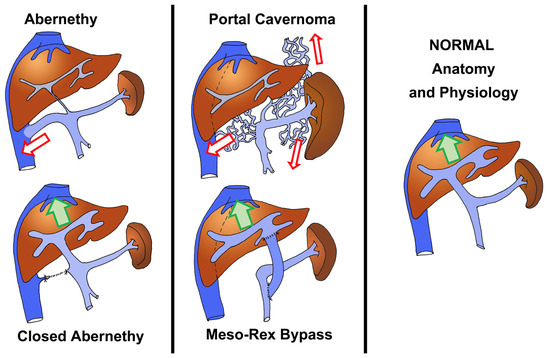 In the majority of cases, PSS is secondary to portal hypertension due to liver disease, but there are a few specific conditions combining PSS and normal liver parenchyma/hepatic function. This is found in most patients with (1) a congenital malformation known as Abernethy malformation (AM) (the latter consists of a large communication between the portal system and the systemic venous circulation), and (2) extrahepatic portal hypertension secondary to the obstruction of the portal vein (OPV) (Figure 1) [17,18,19,20].