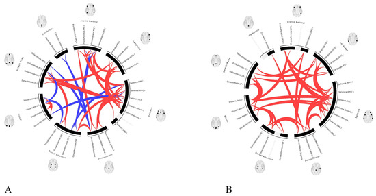 ROI-to-ROI color coded circular graphs show one-sample T-test statistics of the brain connectivity in group 1 patients (A) before LDLT and (B) after LDLT. There was a statistically significant (p < 0.05 FWE) increase in functional connectivity in the default mode, frontoparietal, salience, and sensorimotor networks in group 1 following LDLT. (ROI = Region of interest, LDLT = Living-donor liver transplantation, FEW = Family-wise error, In the color coded circular graph, the edges represent connectivity changes between regions; red connections mean positive T-values indicating increase in functional connectivity; blue color connections mean negative T-values indicating decrease in functional connectivity.