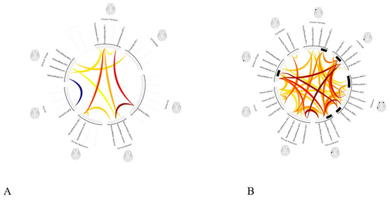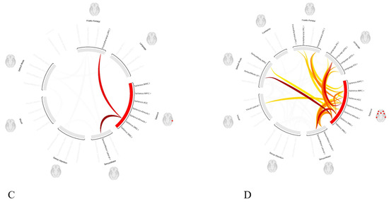 Assessment of the functional connectivity matrix in selected seed areas in RSNs was carried out by a region of interest (ROI) to ROI connectivity matrix comparison and by testing hypotheses [39]. Data visualization was obtained using the CONN toolbox. Functional connectivity measures were computed between seed areas for ROI-to-ROI analysis to identify patterns of ROI-to-ROI connectivity. Specifically, threshold-free cluster enhancement (TFCE) analyses [42,43] were used to make inferences at the cluster level. This was carried out within the framework of ROI-to-ROI connection matrices. TFCE analyses employ an automated hierarchical clustering method that utilizes optimal leaf ordering for hierarchical clustering [43,44]. This method is based on anatomical proximity or functional similarity metrics between regions of interest (ROIs). The analysis involves calculating a TFCE score for each T or F statistic associated with all voxels within the ROIs.