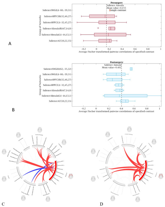 Visual representations of increased functional connectivity throughout the salience network for patients in group 2 after the Meso-Rex bypass compared to the presurgical condition. The graphs show increased median value correlation coefficients (z values transformed using Fisher) throughout the salience network (B) after the Meso-Rex bypass (median value 0.35) compared to the (A) presurgical condition (median value 0.22). (C,D) Color coded circular connectomes show increased functional connectivity throughout the salience network after the Meso-Rex bypass (D) compared to the presurgical condition (C). (In the circular graph, the edges represent connectivity changes between regions, the colors correspond to the network affiliation).