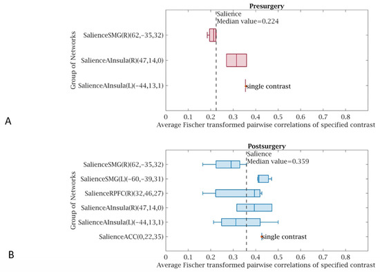 A statistically significant (p < 0.05 FWE) increase in functional connectivity was observed in the default mode, frontoparietal, salience, and sensorimotor networks as compared to the pre-treatment functional connectivity in the same networks, in group 1 following LDLT (Figure 3), and in group 2 after the Meso-Rex bypass (Figure 4). All children showed a highly significant improvement in the salience network after operation. Figure 5 and Figure 6 show comprehensive visual representations of the observed increase in correlation coefficients (z values transformed using Fisher) and functional connectivity across the salience network for both groups following each surgical treatment.