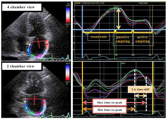 Left atrial strain curve analysis: The right upper panel displays the left atrial (LA) strain curves from a normal subject. The LA strain curve consists of a positive peak during end-systole (reservoir phase), followed by two descending phases: one during early diastole (passive emptying) and the other during late diastole (active emptying). In the right lower panel, LA dyssynchrony is quantified as the maximum difference in time-to-peak regional LA strain, adjusted for the RR interval (referred to as LA time-diff). LA: left atrium; GLS: global longitudinal strain.
