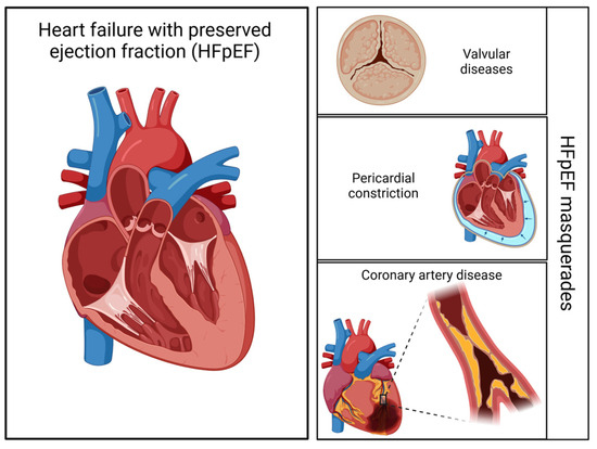 The term “diastolic HF” was originally defined as “an increased resistance to filling in one or both ventricles, causing symptoms of pulmonary congestion due to an abnormal upward shift in the diastolic pressure-volume relation”. This was later redefined as “HFpEF” [1]. Recent diagnostic algorithms classify patients with preserved LVEF and heart failure symptoms under the broad diagnosis of “HFpEF”, despite varying underlying pathologies, treatment options, and prognoses. These HFpEF algorithms rely on clinical symptoms, lab results, echocardiographic data, and/or invasive hemodynamic measurements, which often fall short of identifying the specific underlying diagnosis. When identifiable cardiac conditions such as valvular diseases, significant coronary artery disease, or pericardial constriction are found, they are classified as “HFpEF masqueraders” and should be excluded. Arrhythmias, often stemming from specific cardiac conditions, are also seen as HFpEF masqueraders, with the exception of atrial fibrillation (AF), which is frequently associated with HFpEF symptoms [2,3]. Ultimately, excluding HFpEF masqueraders may lead only to a diagnosis of HFpEF of unknown origin. Non-cardiac conditions—such as pulmonary diseases, anemia, diabetes, systemic infections, cancer, obesity, and frailty—add to the multifactorial complexity of HFpEF as a diagnosis [4,5]. In a study conducted by Shah A.M. et al. [6], it was documented that elevated right and left pressures, left ventricular hypertrophy, as well as right ventricular enlargement, all play a crucial role in outcome estimation. A recent study by Duchnowski et al. identified hs-TnT and NT-proBNP as independent predictors of postoperative cardiogenic shock requiring MCS in heart valve surgery patients. Given NT-proBNP’s role in HFpEF, these findings highlight the importance of hemodynamic monitoring and biomarker evaluation in HF risk stratification, linking myocardial stress and hemodynamic instability to both post-surgical outcomes and HFpEF [7].