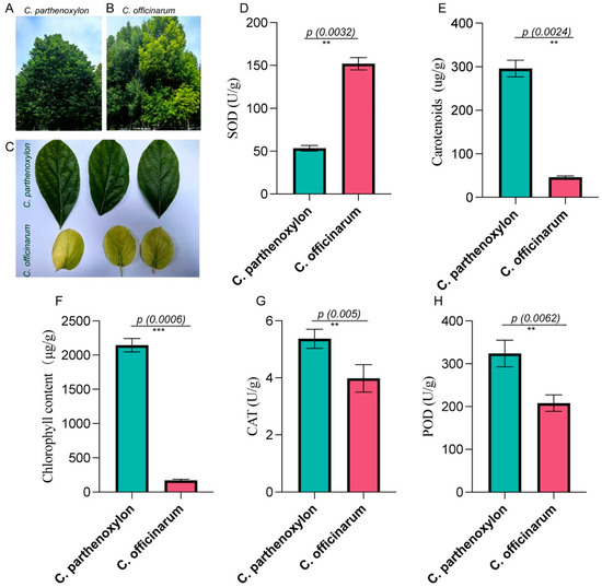 Morphological and physiological differences between C. parthenoxylon and C. officinarum. (A,B) Representative tree morphology of C. parthenoxylon (A) and C. officinarum (B). (C) Comparison of leaf morphology between C. parthenoxylon and C. officinarum, showing differences in leaf size and color. (D–H) Biochemical measurements comparing the two species: (D) SOD activity (U/g fresh weight); (E) carotenoid content (µg/g fresh weight); (F) total chlorophyll content (µg/g fresh weight); (G) CAT activity (U/g fresh weight); and (H) POD activity (U/g fresh weight). Bars represent mean values ± standard error (SE) from three biological replicates. C. officinarum shows significantly higher SOD activity, while C. parthenoxylon demonstrates higher carotenoid content, chlorophyll content, CAT activity, and POD activity. ** = significant at p < 0.01 and *** = significant at p < 0.001.