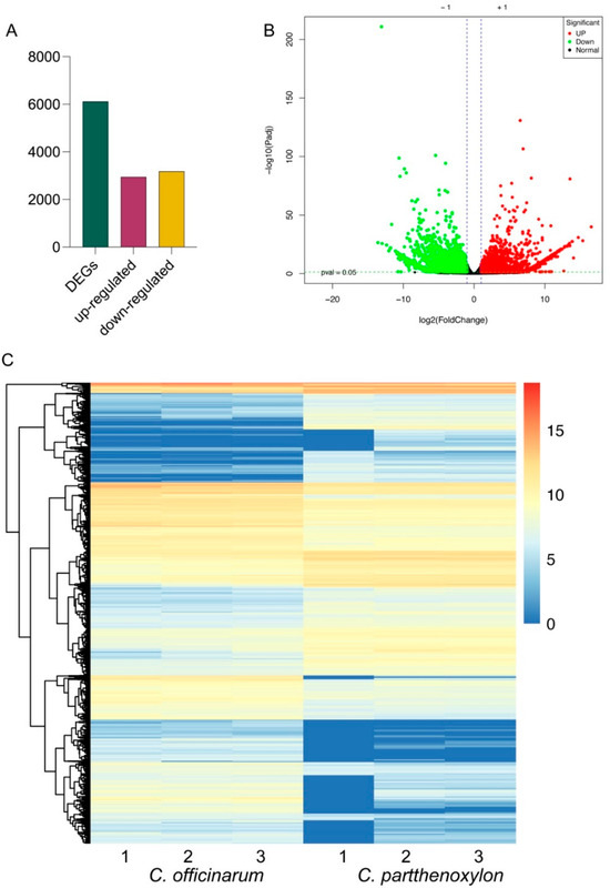 Differentially expressed genes (DEGs) between C. parthenoxylon and C. officinarum. (A) Total number of DEGs identified in the transcriptomic comparison, including the number of upregulated (2940) and downregulated (3183) genes. (B) Volcano plot depicting the distribution of DEGs based on log2 fold change (log2FC) and statistical significance (−log10 p-value). Red dots represent significantly upregulated genes, green dots represent significantly downregulated genes, and black dots indicate non-significant genes. (C) Heatmap showing hierarchical clustering of DEGs across biological replicates for both species. The clustering highlights distinct transcriptional profiles between C. parthenoxylon and C. officinarum. The color scale represents normalized gene expression levels, ranging from low (blue) to high (red).