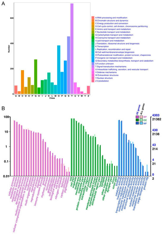 Annotation of differentially expressed genes (DEGs). (A) COG annotation of DEGs. The DEGs were classified into 25 functional categories according to the Clusters of Orthologous Groups (COG) database. The most enriched categories include “General function prediction only (R)”, “Signal transduction mechanisms (T)”, and “Posttranslational modification, protein turnover, chaperones (O)”. Each bar represents the number of DEGs assigned to a specific functional category. (B) GO annotation of DEGs. Gene Ontology (GO) classification is shown for biological process (BP), cellular component (CC), and molecular function (MF) categories. The most enriched terms in BP include “cellular process” and “metabolic process”. In CC, “cell part” and “membrane” were predominant, while in MF, “catalytic activity” and “binding” were highly represented. Bars indicate the number of DEGs associated with each GO term, with separate counts for DEGs and all annotated genes.