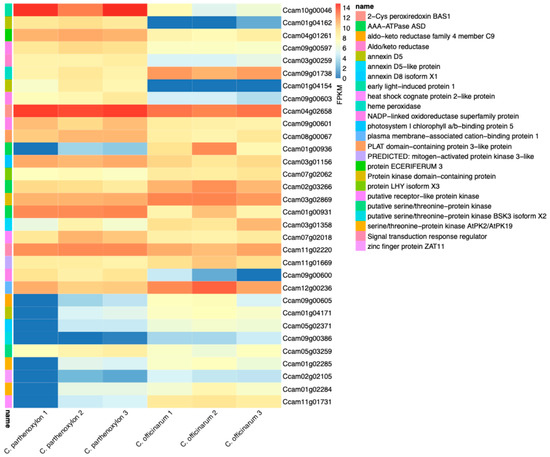 Differential expression of genes associated with cold tolerance in C. parthenoxylon and C. officinarum. The figure presents FPKM (fragments per kilobase of transcript per million mapped reads) values for genes implicated in cold tolerance mechanisms, including 2-Cys peroxiredoxin BAS1, annexin D5, heat shock cognate protein 2-like protein, mitogen-activated protein kinase 3-like, and zinc finger protein ZAT11, among others. Heatmap color intensity represents relative expression levels: warmer color (red) indicates higher expression, and cooler color (blue) represent lower expression.