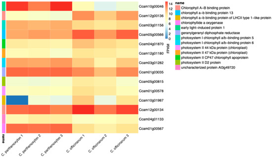 Differential expression of genes associated with photosynthesis in C. parthenoxylon and C. officinarum. The figure illustrates the FPKM values for genes involved in photosynthetic pathways, including chlorophyll a/b-binding proteins, photosystem I and II proteins, and chlorophyllide a oxygenase, among others. Samples are grouped by species and biological replicates, with three replicates for each species. Heatmap color intensity represents relative expression levels: warmer color (red) indicates higher expression, and cooler color (blue) represent lower expression.