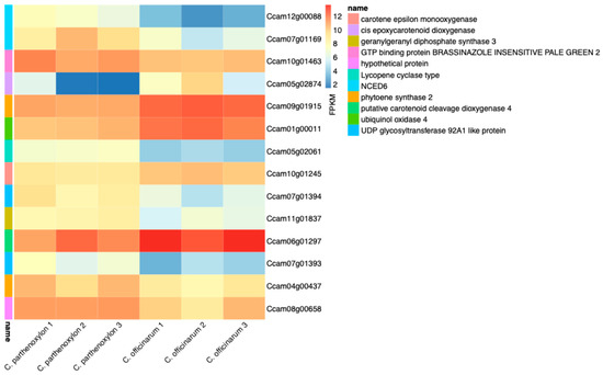 Expression levels of genes associated with carotenoid biosynthesis in C. parthenoxylon and C. officinarum. The figure presents the FPKM values for genes involved in key enzymatic steps of carotenoid biosynthesis, including carotene epsilon monooxygenase, cis-epoxycarotenoid dioxygenase, geranylgeranyl diphosphate synthase 3, phytoene synthase 2, and others. Samples are categorized by species and biological replicates, with clear distinctions between C. parthenoxylon and C. officinarum groups. Heatmap color intensity represents relative expression levels: warmer color (red) indicates higher expression, and cooler color (blue) represent lower expression.
