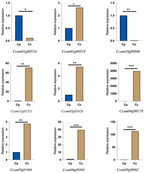 To validate the expression profiles derived from transcriptomic datasets, nine genes were randomly selected, and their relative expression levels were quantified using qRT-PCR in C. parthenoxylon and C. officinarum (Figure 7). The qRT-PCR results confirmed the differential expression trends observed in the transcriptomic analysis, highlighting species-specific expression patterns. For instance, Ccam10g00046 and Ccam09g00962 exhibited significantly higher expression levels in C. parthenoxylon compared to C. officinarum, with fold changes exceeding 50. Similarly, Ccam01g00518 and Ccam05g01860 showed moderate but consistent upregulation in C. parthenoxylon. In contrast, genes such as Ccam04g00178 and Ccam06g00368 were more highly expressed in C. officinarum than in Ccam01g00518, further supporting the transcriptomic data. These findings support the reliability of the transcriptomic dataset and suggest that these genes may play roles in species-specific physiological or biochemical pathways.