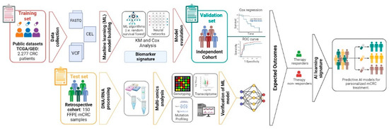 The primary objective of the study is to evaluate the efficacy of the machine learning algorithm in predicting the response to chemotherapy alone or combined with targeted therapy in mCRC patients. The secondary objective is to assess the algorithm’s effectiveness in distinguishing between responsive and non-responsive mCRC patients. The response to therapy with the identified biomarker signature will be studied in (a) 2277 CRC patients using public datasets from The Cancer Genome Atlas (TCGA) and Gene Expression Omnibus (GEO) and (b) a retrospective study analyzing formalin-fixed paraffin-embedded (FFPE) tumor samples from a cohort of metastatic or recurrent CRC patients who underwent surgery at ISMETT’s Surgical Unit over the past 10 years.