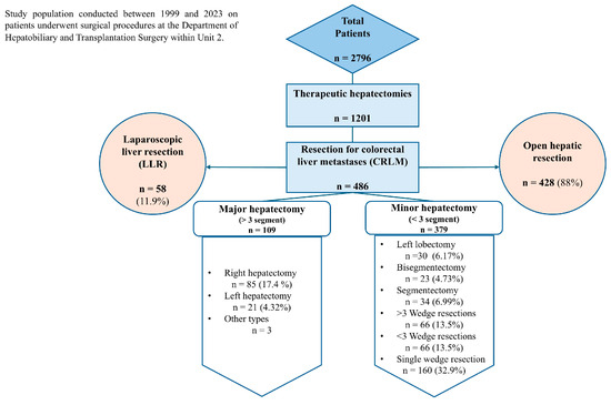 Between 1999 and 2023, a total of 2796 patients underwent surgical procedures at Unit 2. Prior to surgery, each patient underwent a comprehensive review by a multidisciplinary tumor board to evaluate resectability and develop an optimal resection strategy. A total of 1201 therapeutic hepatectomies were conducted at the Department of Hepatobiliary and Transplantation Surgery within Unit 2. Particularly, between 1999 and 2023, a cohort of 486 patients underwent hepatic resection for colorectal liver metastases (CRLM) [14,16]. Of these patients, 428 (88%) underwent open hepatic resection, while 58 (11.9%) underwent laparoscopic liver resection (LLR). The cohort can be stratified into two groups: those who underwent major hepatectomy, defined as the resection of three or more liver segments, and those who underwent minor hepatectomy, involving the resection of fewer than three segments.