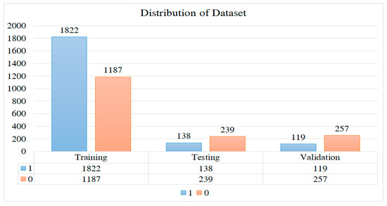 Table 2 and Figure 1 outline the distribution of images for training, testing, and validation purposes. In total, there are 3762 images, with 3009 allocated for training, 376 for testing, and 377 for validation. These images encompass both classes 0 and 1. The ratio of images is as follows: 80% for training, 10% for validation, and 10% for testing.
