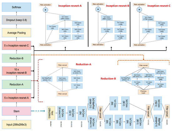 InceptionResNetV2 (Figure 4) stands as a complex convolutional neural network (CNN) architecture primarily tailored for tasks in image classification and computer vision. It seamlessly merges the following two prominent CNN designs: Inception, recognized for its effective feature extraction, and ResNet, esteemed for its ability to tackle training challenges in deep networks. By integrating Inception modules for feature extraction and ResNet’s residual connections, Inception-ResNetV2 embodies the strengths of both approaches. Its architecture comprises stem and grid components, with the stem managing the initial image processing and the grid housing stacked Inception-ResNet modules. These modules execute multi-scale feature extraction, amalgamating diverse convolutional pathways while ensuring robust gradient flows through residual connections.