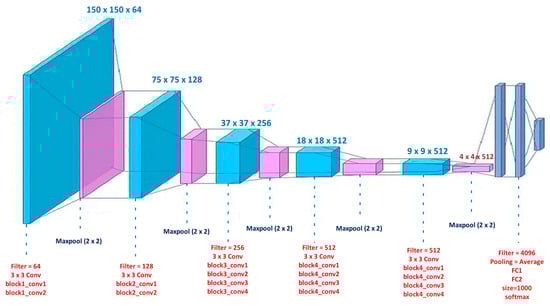 Architecture for VGG19, highlighting its deep structure with sequential convolutional layers, which contribute to hierarchical feature learning [43].