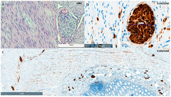 (a–c) A histological section of a resected colon–aganglionic segment from a patient with HD. (a) Myenteric aganglionosis associated with nerve trunk hypertrophy (H&E staining; scale bar 100 µm). (b) The exact diameter of the nerve trunk was determined on S-100-immunostained sections using digital morphometry (×400 magnification). (c) Myenteric and submucosal nerve hypertrophy in aganglionosis (rectum defined as ≥40 µm in diameter) is considered to be supportive of the diagnosis of HD. Active mucosal inflammation (enterocolitis) may also be observed.