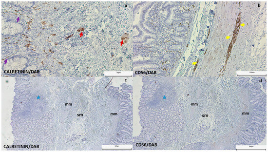 (a–d) Calretinin and CD56 immunohistochemistry in patients diagnosed with Hirschsprung’s disease. (a) A histological section of a resected colon: normal segment from a patient with HD showing calretinin/DAB-positive ganglion cells in the submucosa (red arrows) and their extended nerve fibers in the lamina propria (purple arrows). Scale bar: 50 µm. (b) CD56/DAB staining visualizes the ganglion cells of the muscularis propria and submucosa (yellow arrows). Scale bar: 100 µm. (b) CD56/DAB-positive ganglion cells of the muscularis propria and submucosa (yellow arrows). Scale bar: 100 µm. (c,d) Rectal biopsy of the patient showing disorganization of the muscularis mucosae and lymphocytic infiltrate in the mucosa (blue star), but with negative staining for calretinin (c) and CD56 immunohistochemistry (d). Scale bar: 500 µm. Note: m—mucosa; mm—muscularis mucosae; sm—submucosa.