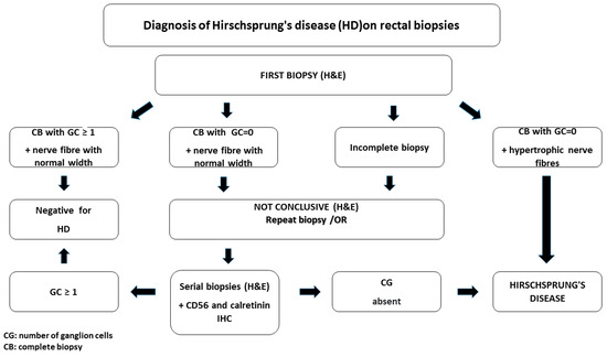 In this context, we believe that the proposed outcome-based diagnostic algorithm for the diagnosis of HD would facilitate the optimization of the processing and evaluation of intestinal biopsies, thus initiating the stepwise and timely implementation of histological and immunohistochemical methods to confirm or exclude aganglionosis.