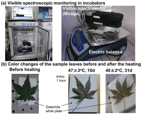 A sample leaf was placed on a white diatomite plate on an electric balance inside the incubators (Figure 3a,b). The sample reflectance spectrum was measured every 1 h for about 10 days at 47 ± 3 °C and 40 ± 2 °C and for about 31 days at 29 ± 2 °C. These heating and measurement conditions are listed in Table 1. Temperatures, relative humidity, and weights were monitored during these periods. The temperature fluctuations were within ± 3 °C. No significant weight changes were noticed during the experimental periods. The measuring light was applied to the leaf samples only for about 2 s every 1 h, so no photochemical damage was seen (Figure 3b). The reflectance spectra of diatomite plates showed flat reflectance without noticeable absorption bands but reflectance values changed with diatomite plates.