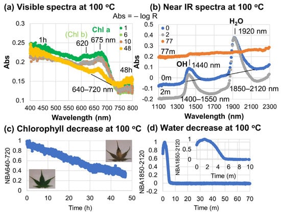 This absorbance (Abs = −log R) is directly related to the concentrations (c) (mol·L−1) of species in absorption spectroscopy through Lambert–Beer’s law with the sample thickness d (cm) and the molar absorption coefficient ε (L·mol−1·cm−1) (Equation (2)). Representative absorption spectra of a sample leaf heated to 100 °C are shown in Figure 4a,b.