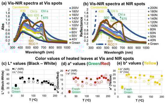 Color b* (yellow) values of the five positions of the fresh green leaf were around 8, indicating slightly yellowish colors, while all the heated leaves showed more yellowish colors (Figure 5e), and b* values were generally larger for the NIR spots than for the Vis spots, indicating more yellowish colors with strong light irradiation. This yellowing of heated leaves can correspond to remaining carotenoids plus their degradation products around 430 nm in absorption spectra (Figure 5a,b).