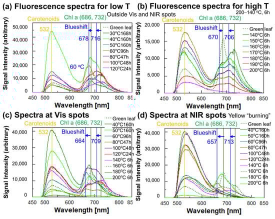 After heating of the green leaves, the 686 + 732 fluorescence bands showed changes in their positions and shapes (Figure 6). At low temperatures of 30, 40 and 50 °C, the 686 and 732 nm band positions did not change greatly, while at 60 °C, they blueshifted to 678 and 716 nm, respectively, outside the Vis and NIR spots (Figure 6a). At these positions, at higher temperatures of 140 to 200 °C for 6 h, they blueshifted to 670 and 706 nm, respectively, until 190 °C, while at 200 °C they become unrecognizable (Figure 6b). These blueshifts of the 686 and 732 nm bands were also observed for the Vis spots to 664 and 709 nm, respectively, and for the NIR spots to 657 and 713 nm, respectively (Figure 6c,d). These fluorescence maxima positions are summarized in Table 2.