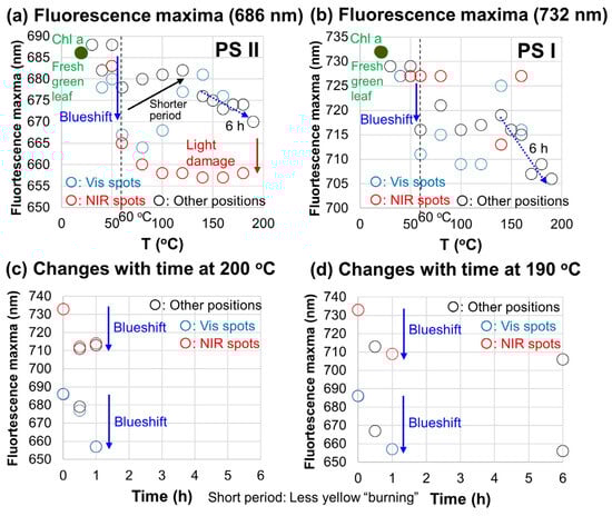 The 732 nm band positions were also around the original 732 nm at 30, 40 and 50 °C, while they generally decreased at higher temperatures from 60 °C, with some fluctuations (Figure 7b). For the same heating duration of 6 h at 140 to 200 °C, systematic blueshifts for higher temperatures were recognized for the positions outside the Vis and NIR spots (Figure 7b: open black circles). The NIR spots did not show further decreases, suggesting no significant photochemical effects on the 732 nm band due to Chl a in PSI.